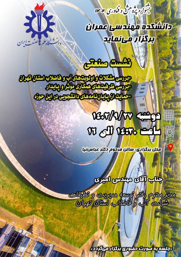 | دانشکده مهندسی عمران دانشگاه علم و صنعت ایران در نظر دارد نشست صنعتی تحت عنوان «بررسی مشکلات و اولویتهای آب و فاضلاب استان تهران؛ بررسی ظرفیتهای همکاری مؤثر و پایدار؛ حمایت از پایاننامههای دانشجویی در این حوزه» توسط مهندس سهیل امیری، مدیر محترم دفتر توسعه مدیریت و تحقیقات شرکت آب و فاضلاب استان تهران برگزار نماید. این جلسه بهصورت حضوری در روز دوشنبه ۲۷ آذرماه ۱۴۰۲ ساعت ۱۴:۳۰ الی ۱۶ در سالن کنفرانس دکتر عباسنیا واقع در ساختمان شماره ۱ دانشکده مهندسی عمران برگزار خواهد شد. از علاقهمندان جهت شرکت در این نشست دعوت بهعمل میآید. |
